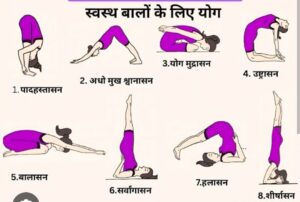 बालों का झड़ना रोकने और सही ग्रोथ के लिए कई योगासन हैं जो खोपड़ी (scalp) में रक्त संचार बढ़ाकर और तनाव कम करके मददगार साबित होते हैं। शीर्षासन, सर्वांगासन, अधोमुख श्वानासन (Downward Dog), उत्तानासन (Forward Bend), और वज्रासन सबसे प्रभावी योगासन हैं। ये आसन जड़ों को पोषण और ऑक्सीजन देते हैं, जिससे बाल मजबूत, घने और लंबे होते हैं।