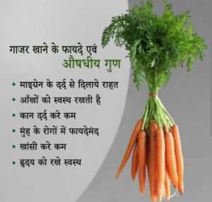 इसमें मौजूद एंटीऑक्सीडेंट्स हृदय के लिए फायदेमंद है। गाजर में मौजूद पोटैशियम रक्तचाप को नियंत्रित करता है। इसमें पाया जाने वाला फाइबर वजन को नियंत्रित करता है जो पाचन तंत्र के लिए भी बेहद फायदेमंद है। गाजर में लाइकोपिन होता है जो हृदय रोग में रामबाण दवा होता है। गाजर में वसा न के बराबर होता है लेकिन पौष्टिकता भरपूर होती है। इससे आधासीसी, कान का दर्द, मुंह में बदबू, पेट दर्द जैसी बीमारियों में भी लाभ मिलता है।