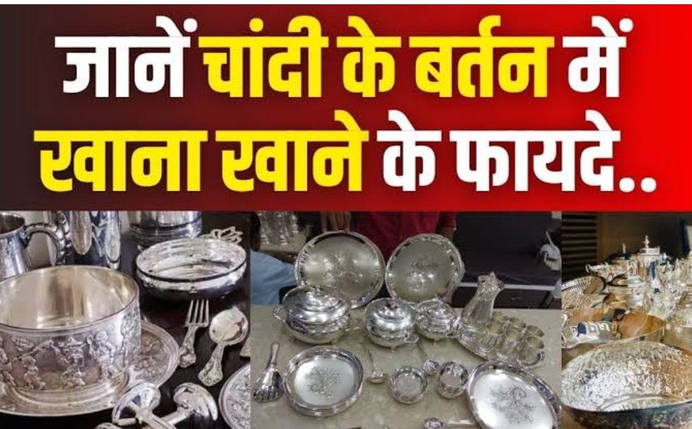 चांदी: चांदी भी पूरी तरह शुद्ध होती है और वो जिन तत्वों से बनी होती है उसमें खाना खाने से उसके तत्व शरीर के भीतर सीमित मात्रा में पहुुंचते हैं। इन तत्वों से शरीर की हड्डियों से लेकर मांसपेशी और रोग प्रतिरोधक क्षमता को संतुलित रखता है। शरीर की रोग प्रतिरोधक क्षमता के खिलाफ कोई तत्व बनता है तो चांदी के माइक्रो एलीमेंट उस तत्व को रोकने या खत्म करने का काम करते हैं। चांदी के बर्तन में खाना खाने से रक्तसंचार की गति भी संतुलित रहती है।